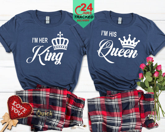 Matching His and Hers King Queen Tartan Pyjamas, White Tops Couple Valentines Gifts, Boyfriend girlfriend Couple matching Christmas pajamas