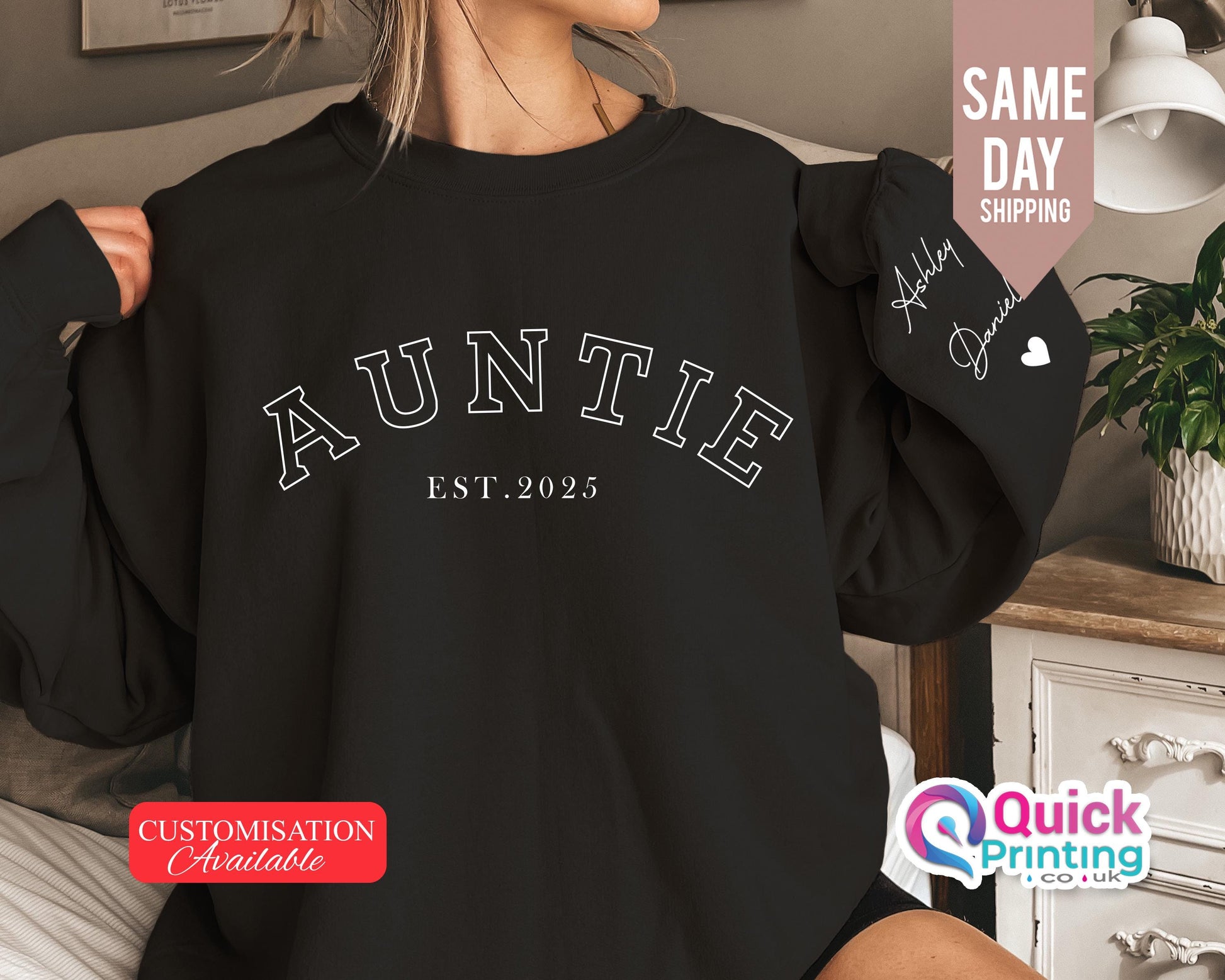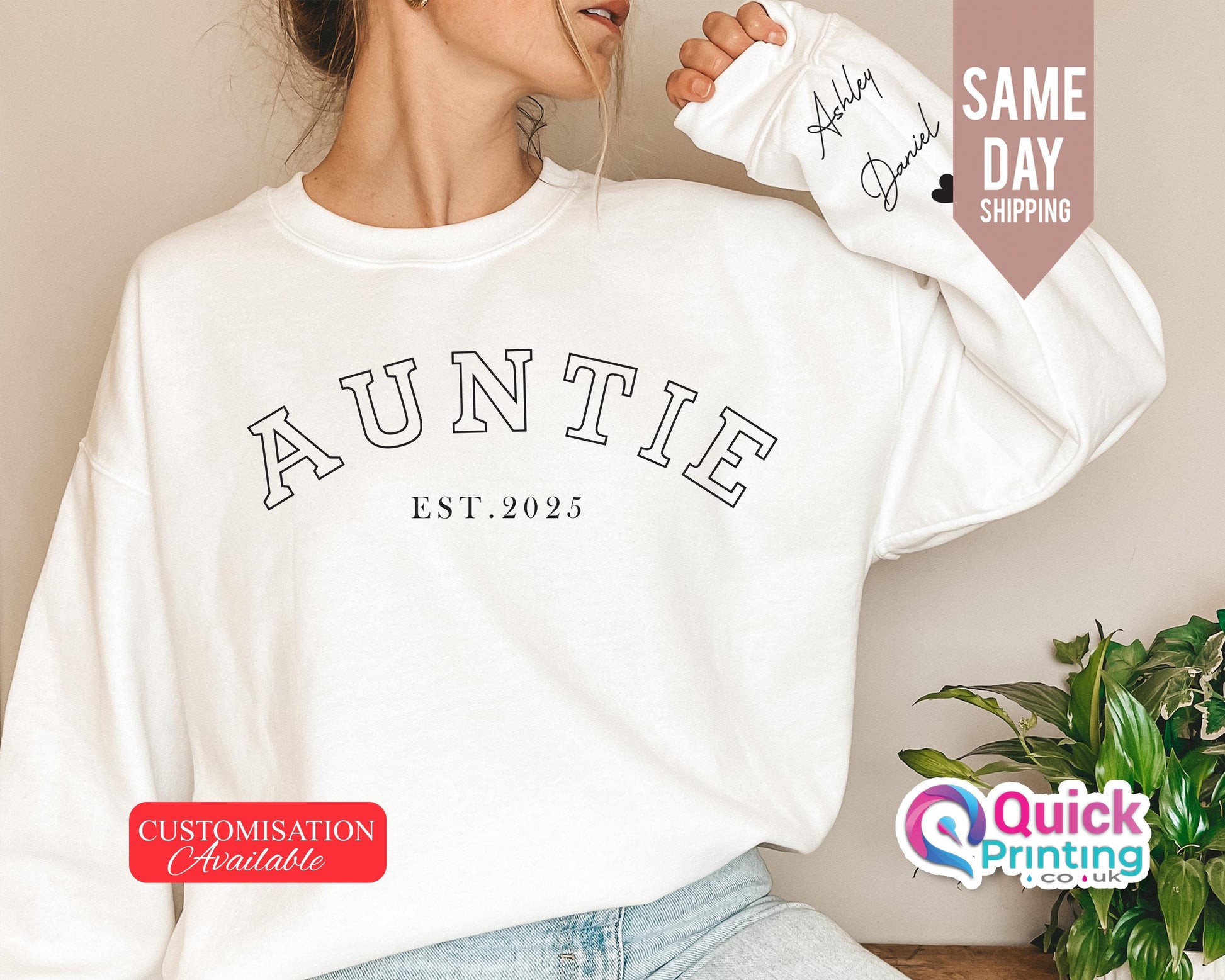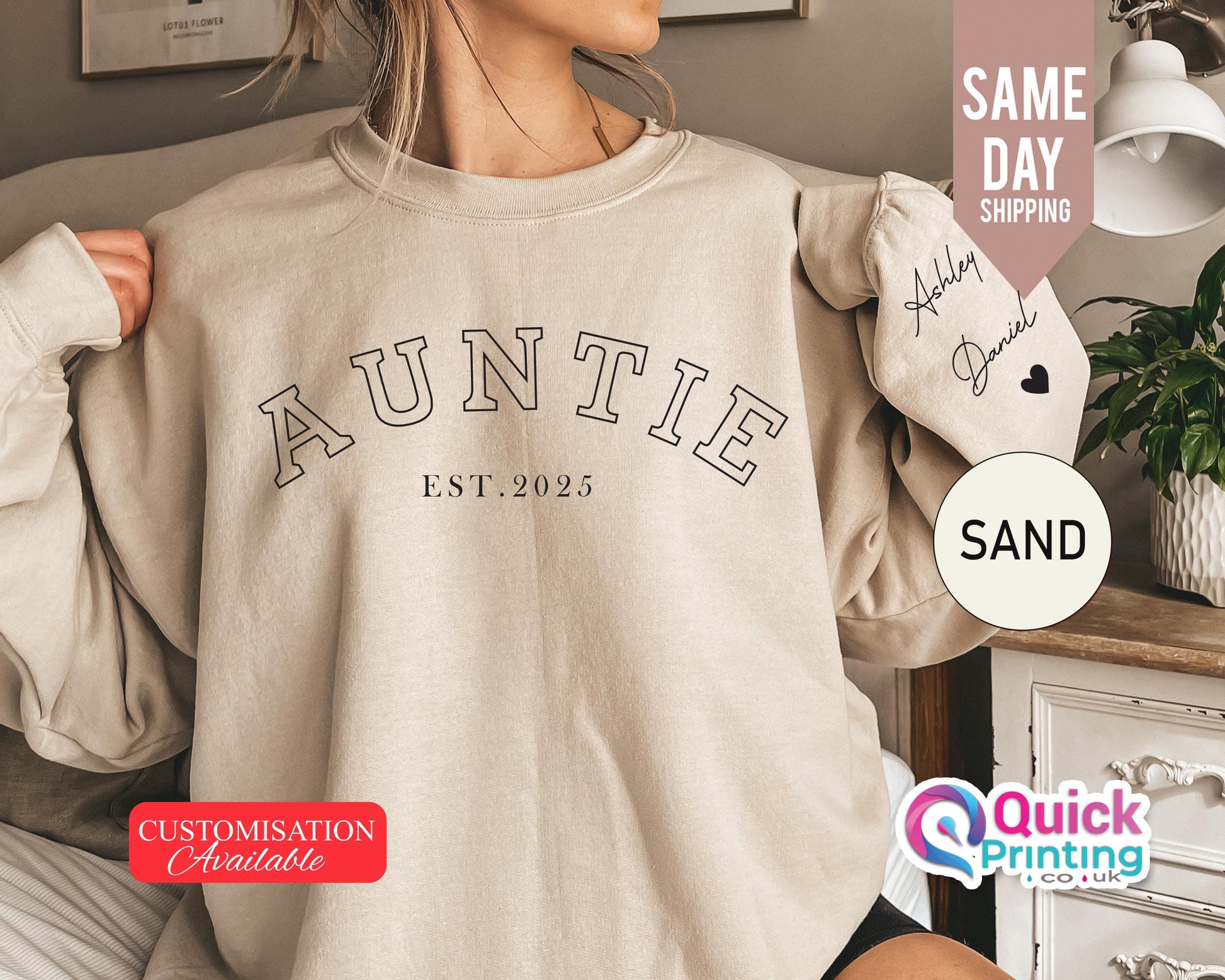 Custom Auntie Sweatshirt: Personalized Name Sleeve, New Aunt Gift
