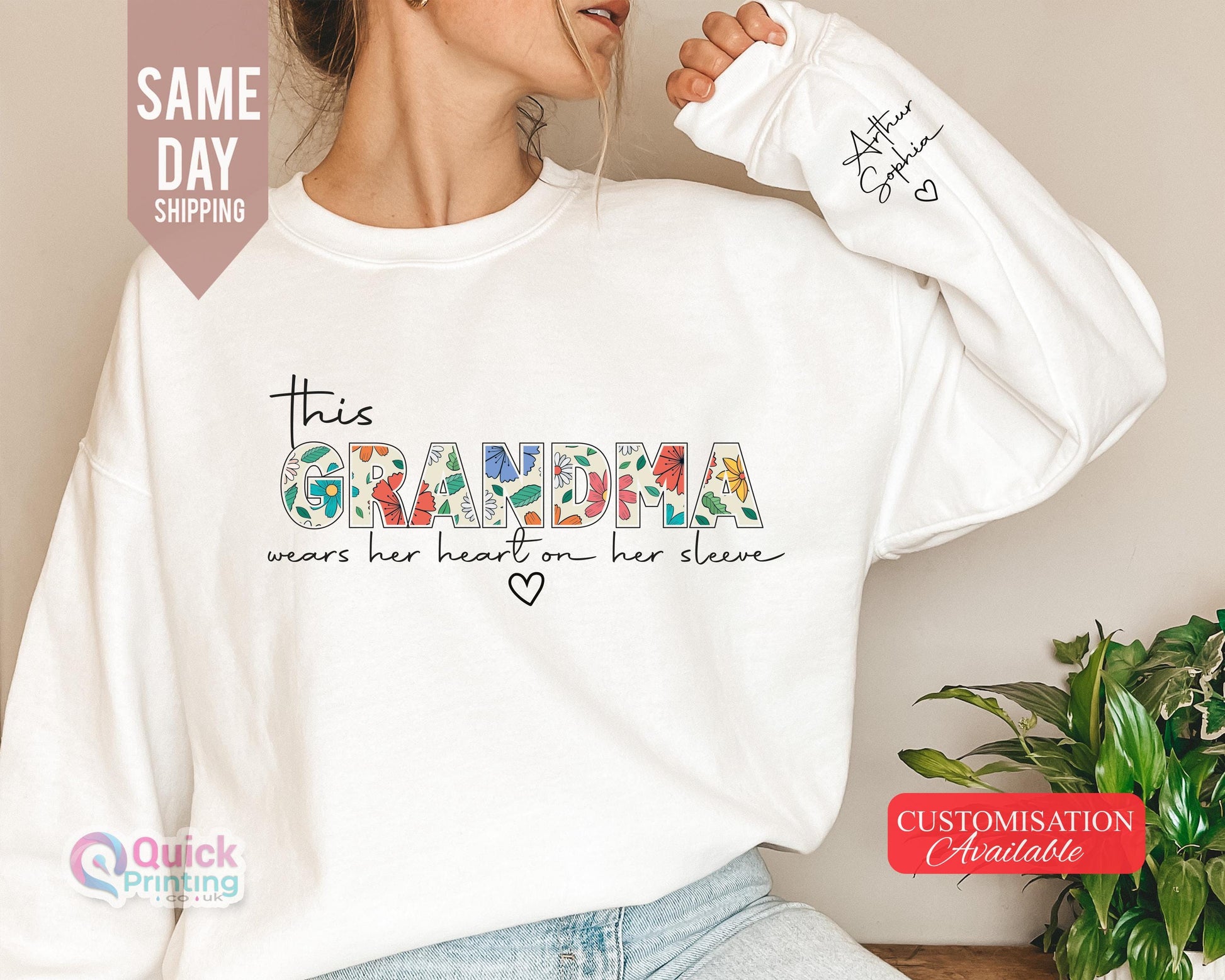 Grandma sweatshirt, Christmas Gift for Granny, Custom Sweatshirt for Grandma, I Wear My Heart On My Sleeve, Sweatshirt with Name on Sleeve