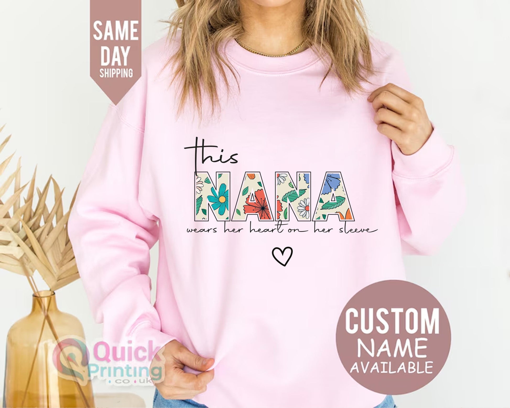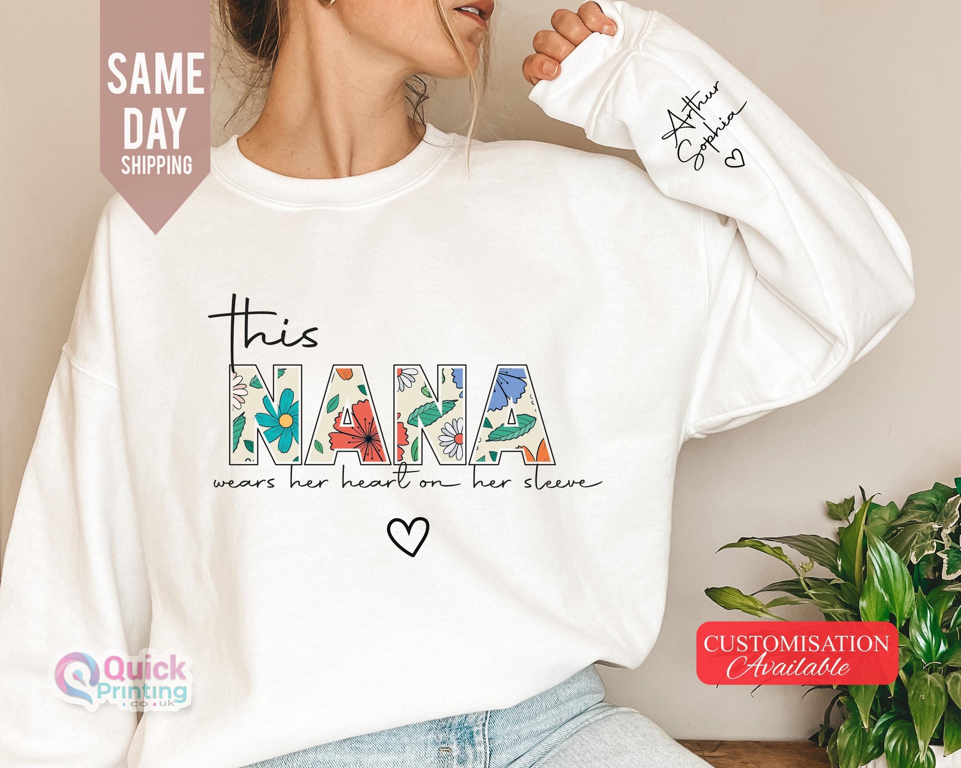 Nana sweatshirt 2025, Christmas Gift for Granny, Custom Sweatshirt for Nana, I Wear My Heart On My Sleeve, Sweatshirt with Name on Sleeve