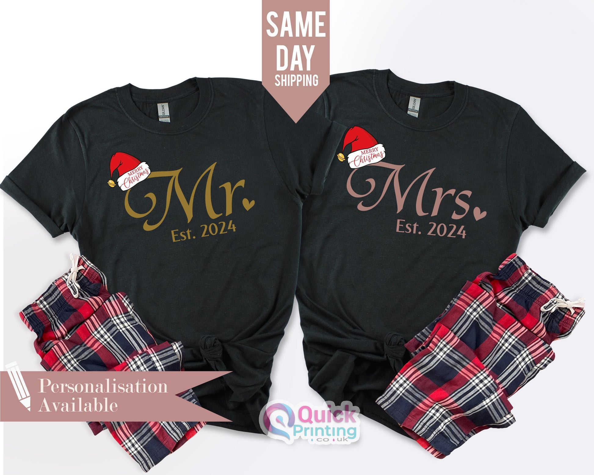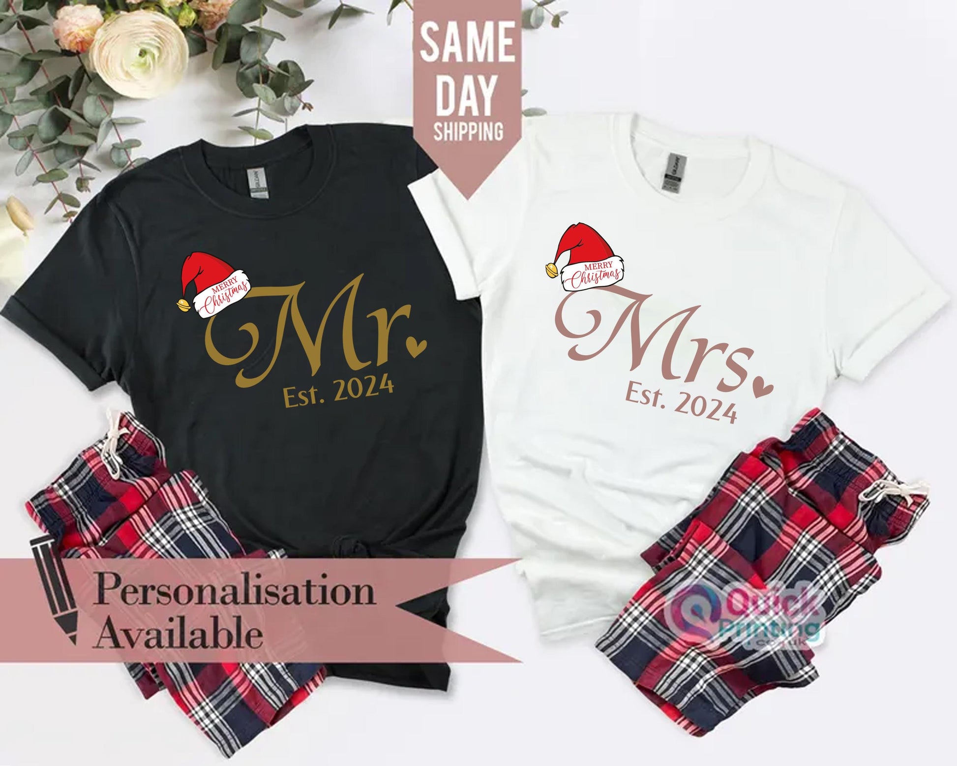 Personalised Mr Mrs Matching Christmas Couple Tshirt, Hubby Wifey Shirts, Newly married Christmas Shirt, Honeymoon Tshirt, Christmas Gifts