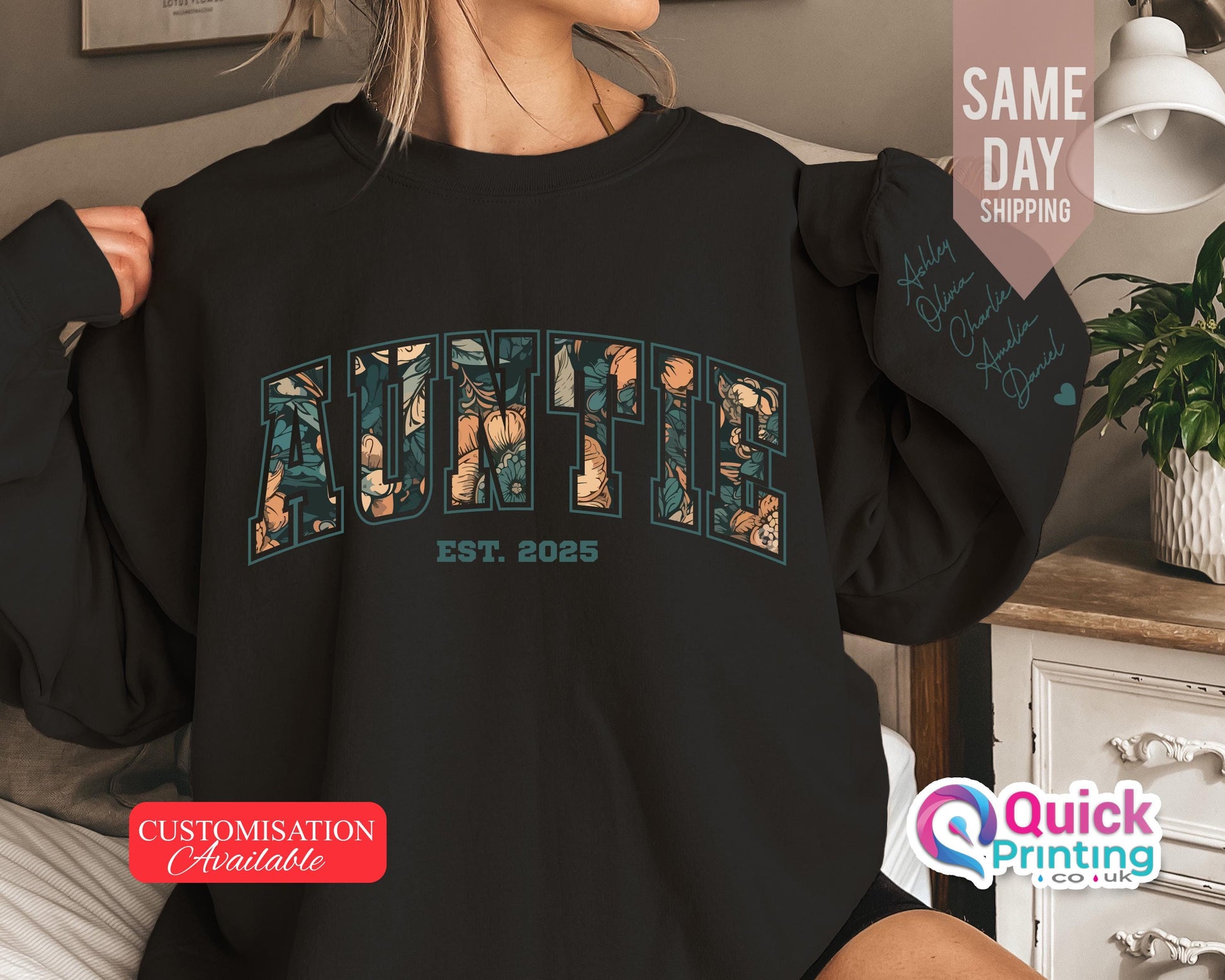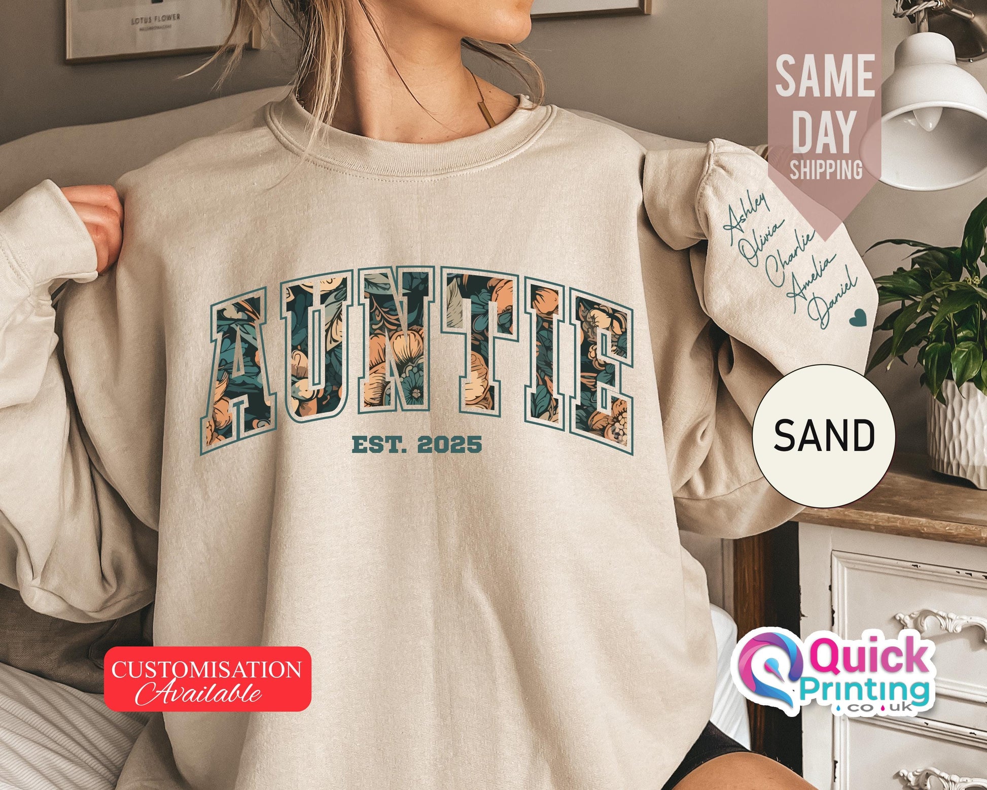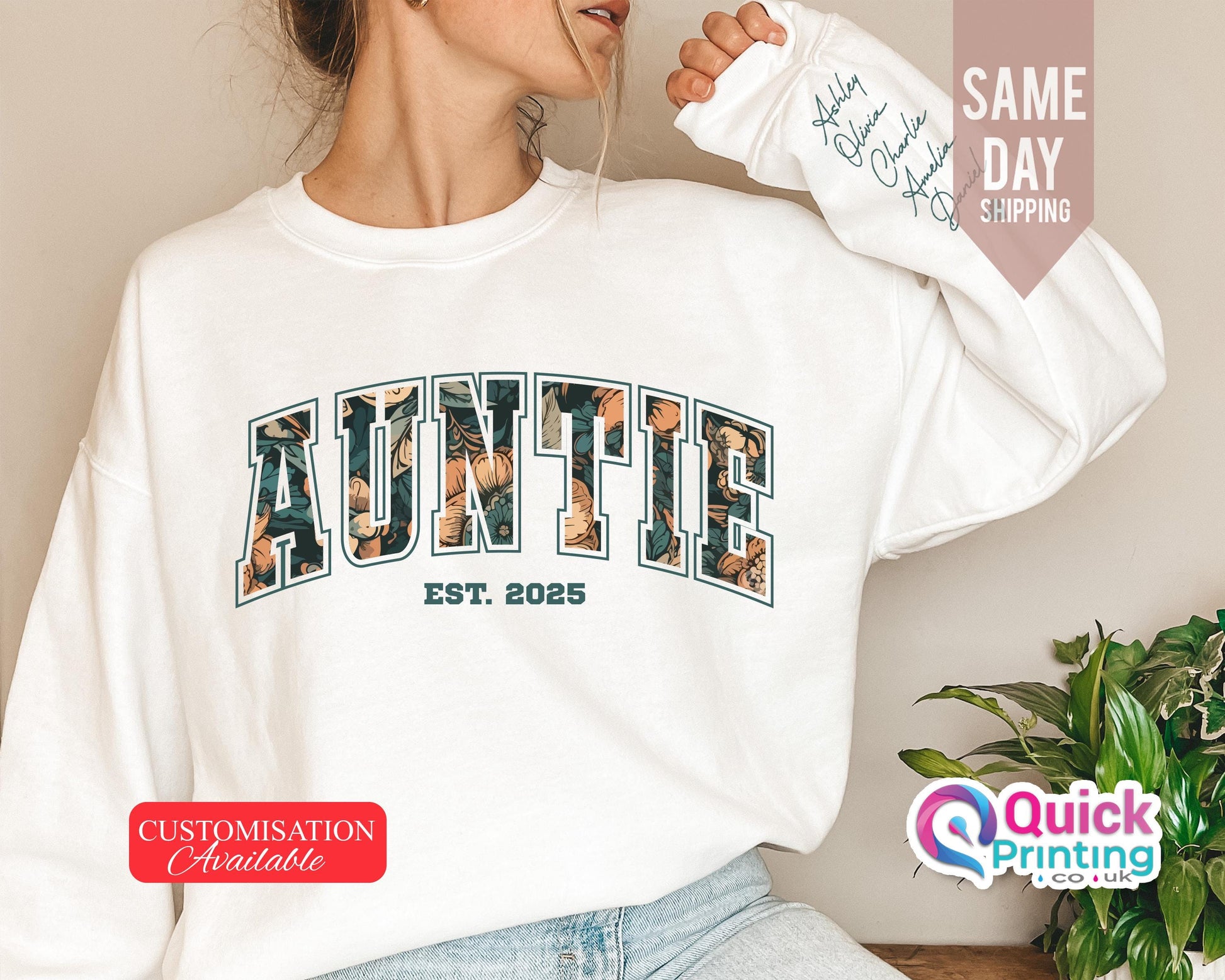 Personalized Auntie Sweatshirt: Floral Letter Print, Custom Names Sleeve