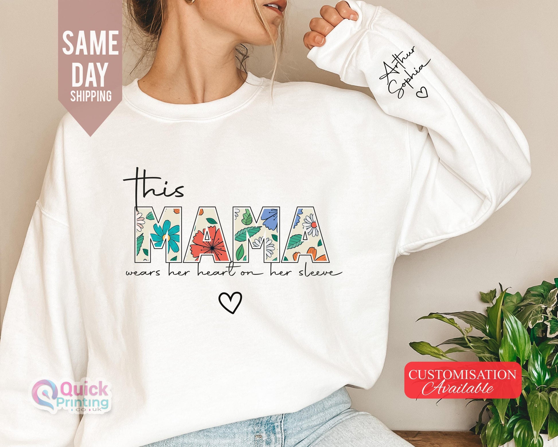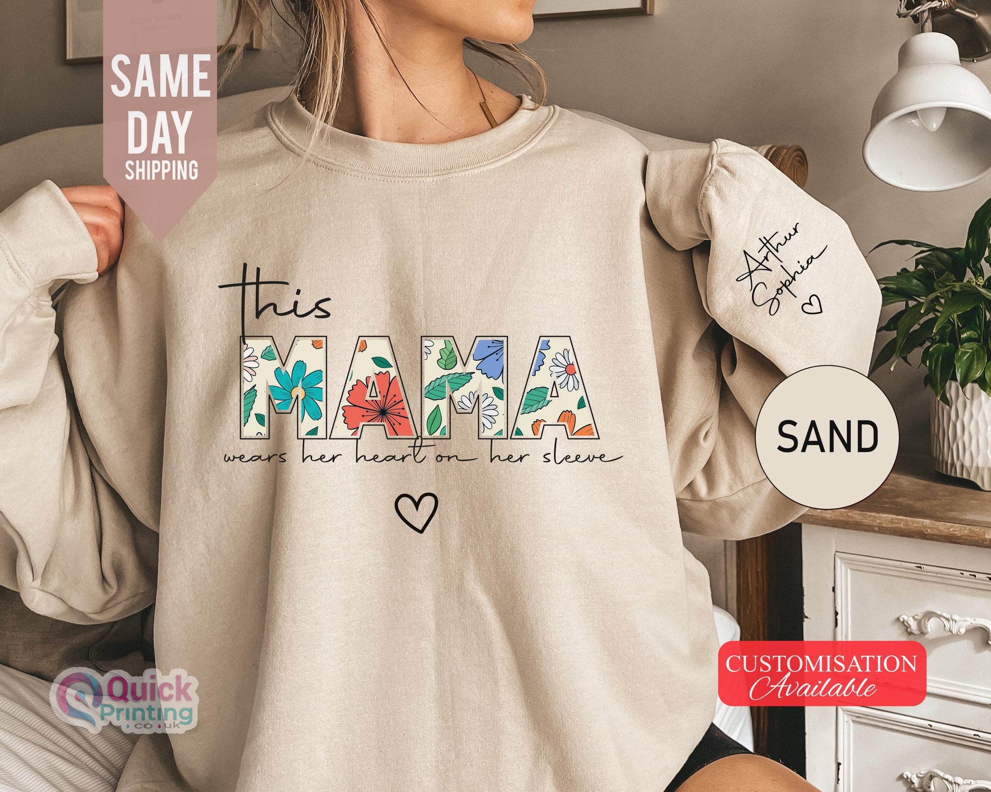 This Mama Wear Her Heart On her Sleeve sweatshirt, Custom Sweatshirt for Mama, I Wear My Heart On My Sleeve, Sweatshirt with Name on Sleeve